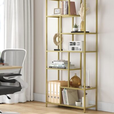 NOCH EINE FUNKTION MEHR Dieses Bücherregal verfügt über 4 Regalböden sowie einen Schrank mit Doppeltür. So können Sie Fotoalben von neugierigen Gästen oder Ihr gutes Geschirr von Staub fernhalten. ZICK-ZACK Verschönern Sie Ihre Wände mit diesem originellen Regal, welches über unregelmäßig angeordnete Trennwände verfügt. Dieses Zick-Zack-Muster bringt Abwechslung und Kreativität in Ihre Wohnung! ALLES IN BALANCE Verabschieden Sie sich von schiefen Regalen, die die Harmonie in Ihrer Wohnung empfindlich stören! Dank der verstellbaren Füße steht dieses Wohnzimmerregal stets parallel zum Boden, ohne sich störend zur Seite zu neigen. ERWEITERN SIE IHRE SAMMLUNG Mit einem stabilen Stahlgestell und Holzspanplatten ausgestattet, bietet dieses Bücherregal viel Platz für Sammlungen aller Art. Bücher, Pokale, Urlaubssouvenirs – jede Ablage ist mit Gegenständen bis zu 20 kg belastbar. WAS SIE BEKOMMEN Eine klare und leicht zu befolgende Anleitung, einen Kippschutz für mehr Sicherheit, einen Schraubenzieher und einen stilvollen Bücherschrank im Industriestil. Produktdetails Farbe: Vintagebraun-Schwarz Material: Holzspanplatte, Stahl Größe: 30 x 74 x 154,5 cm (T x B x H) Gewicht: 25 kg Max. statische Belastbarkeit pro Regalebene: 20 kg Lieferumfang 1 x Bücherregal 1 x Zubehörpaket 1 x Kippschutz 1 x Anleitung (DE, EN, ES, FR, IT)