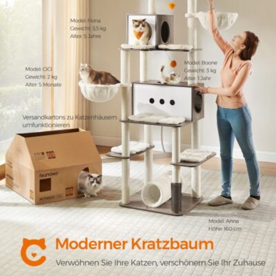 VON PFOTEN GETESTET, VON KATZEN GELIEBT In einem liebevoll eingerichteten Kreativstudio haben zwei flauschige Produkttester diesen Kratzbaum gründlich inspiziert – mit höchstem Komfortanspruch. Ob zum Klettern, Dösen oder Beobachten: Dieser Turm bietet alles, was anspruchsvolle Fellnasen sich wünschen. DIE VORZÜGE AUF EINEN BLICK Besonders beliebt bei den Testkatzen: die zwei großen, gemütlichen Kuschelhöhlen für ruhige Rückzugsorte und die drei flauschigen Aussichtsplattformen, die beste Sicht auf das Revier bieten. Auch das Kratzbrett im unteren Bereich war ein klarer Favorit – perfekt für die tägliche Krallenpflege. STABILITÄT TRIFFT SICHERHEIT Dank extra dicker Sisalstämme und einer verstärkten Bodenplatte bleibt der Kratzbaum auch bei aktiven Sprüngen und wilden Klettereinlagen standfest. Für noch mehr Sicherheit sorgt der mitgelieferte Kippschutz, der die Konstruktion zuverlässig an Ort und Stelle hält. KLETTERSPAß FÜR JEDES ALTER Die durchdacht platzierten Ebenen ermöglichen es Ihrer Katze, mühelos von einer Plattform zur nächsten zu gelangen. Ob jung, verspielt oder schon etwas gemütlicher – dieser Kratzbaum ist für jedes Alter geeignet und lädt zum ausgiebigen Toben, Beobachten und Ruhen ein. DESIGN UND KOMFORT IM EINKLANG Der elegante Rauchgrau-Ton fügt sich nahtlos in moderne Wohnumgebungen ein, während der weiche Plüschbezug für höchsten Liegekomfort sorgt. Ein Katzenmöbelstück, das Funktionalität, Sicherheit und Stil auf den Punkt bringt. PRODUKTDETAILS Farbe: Rauchgrau Material: CARB-zertifizierte Holzspanplatte, Plüsch, Sisal Größe: 60 x 55 x 172 cm (B x T x H) Gewicht: 29,1 kg LIEFERUMFANG 1 x Kratzbaum 1 x Anleitung (DE, EN, FR, ES, IT)