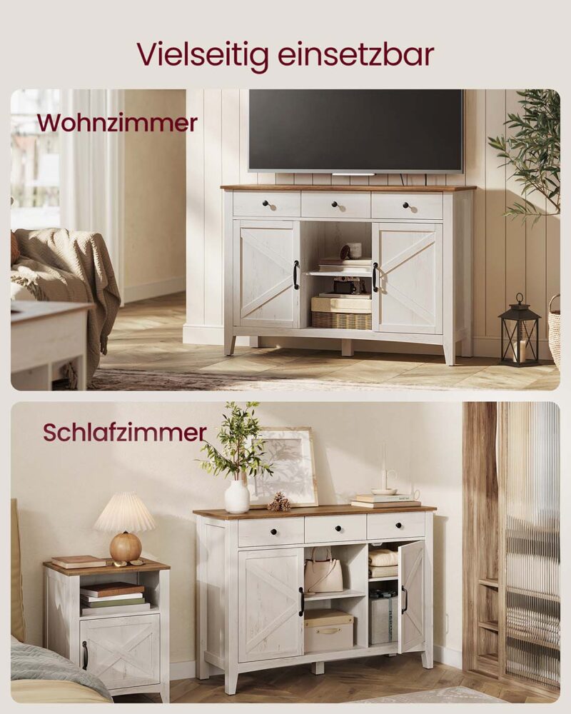 Drei geraeumige Schubladen fuer Kleinigkeiten, eine grosse Deckplatte fuer Dekorationen sowie offene Faechern und Tuerenfaecher bieten reichlich Platz fuer unterschiedlichste Aufbewahrungsbeduerfnisse.