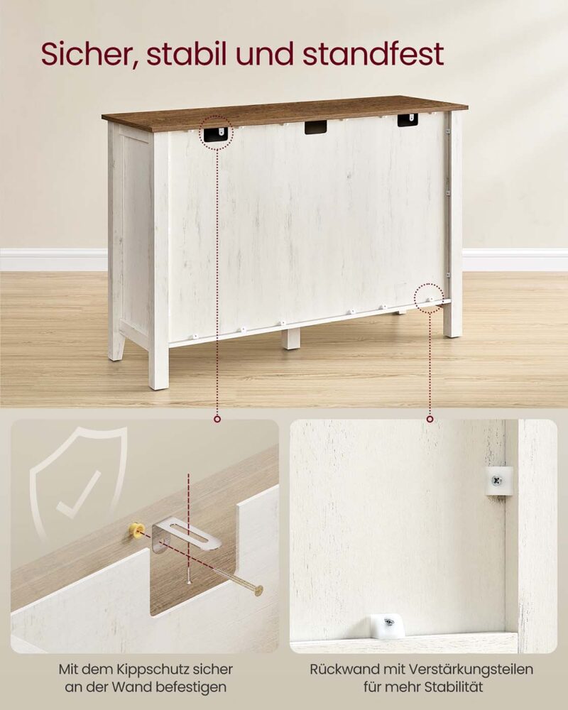 Gefertigt aus MDF- und Holzspanplatten ist der Buffetschrank stabil, langlebig und sorgt fuer Ordnung und Komfort ueber Jahre hinweg.