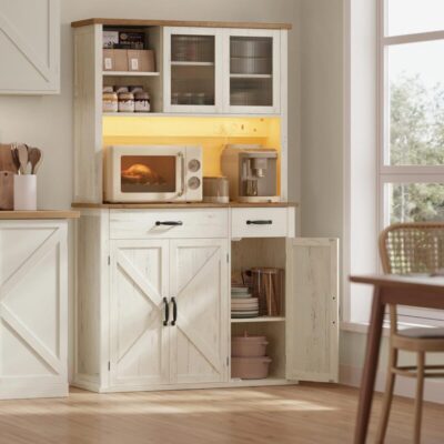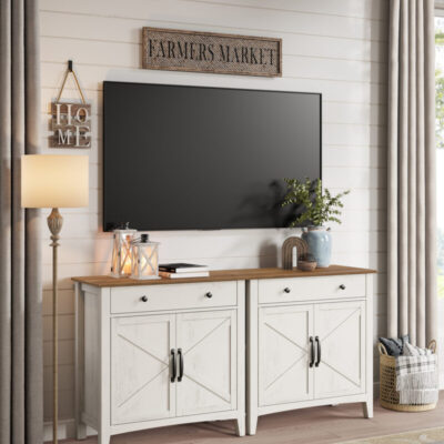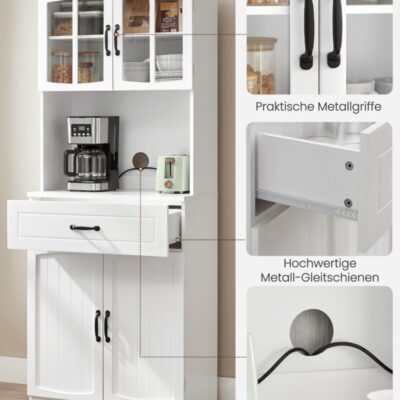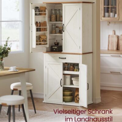 Hinter dem modernen Look steckt durchdachte Funktionalitaet: Zwei offene Fächer mit 5-fach verstellbarer Ablage bieten Platz für Alltagsgegenstände, waehrend zwei Tuerschraenke mit jeweils verstellbaren Einlegeböden und eine grosszuegige Oberflaeche jede Menge Stauraum schaffen.