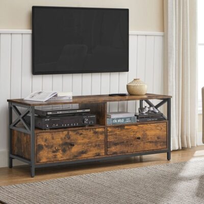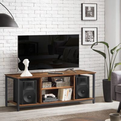 VIEL PLATZ FÜR ALLES Mit einer großzügigen 147 x 40 cm Ablagefläche bietet dieses TV-Lowboard Platz für Fernseher bis zu 65 Zoll. Drei offene Fächer geben Ihren Dekoartikeln einen stilvollen Rahmen, während drei Schubladen diskreten Stauraum für Fernbedienungen, Kabel und mehr bieten. INDUSTRIELLER CHARME TRIFFT AUF VINTAGE-LOOK Die warme Holzoptik kombiniert mit schwarzem Stahl und markanten X-Streben macht diesen Fernsehschrank zum Blickfang in Ihrem Wohnraum. Ein Möbelstück, das Funktionalität mit Charakter verbindet. ROBUSTE MATERIALIEN, LANGLEBIGES DESIGN Der Mix aus Holzspanplatte und stabilem Stahlrahmen sorgt für hohe Belastbarkeit – bis zu 105 kg insgesamt. Die Tischplatte trägt problemlos Ihr TV-Gerät, während der restliche Stauraum stark und zuverlässig bleibt. SCHNELLER AUFBAU, MEHR ZEIT ZUM ENTSPANNEN Mit klar gekennzeichneten Bauteilen und einer gut strukturierten Anleitung ist der Aufbau im Handumdrehen erledigt. Perfekt, um direkt den ersten Filmabend zu genießen. WAS SIE BEKOMMEN Einen funktionalen und stilvollen TV-Schrank mit ausreichend Stauraum, stabiler Bauweise und verstellbaren Füßen, die Bodenunebenheiten mühelos ausgleichen. PRODUKTDETAILS Farbe: Vintagebraun-Schwarz Material: Holzspanplatte, Stahl Größe: 147 x 40 x 50 cm (L x B x H) Gewicht: 36,5 kg Max. Belastbarkeit Tischplatte: 65 kg Max. Gesamtbelastbarkeit: 105 kg LIEFERUMFANG 1 x Fernsehtisch 1 x Zubehörpaket 1 x Anleitung