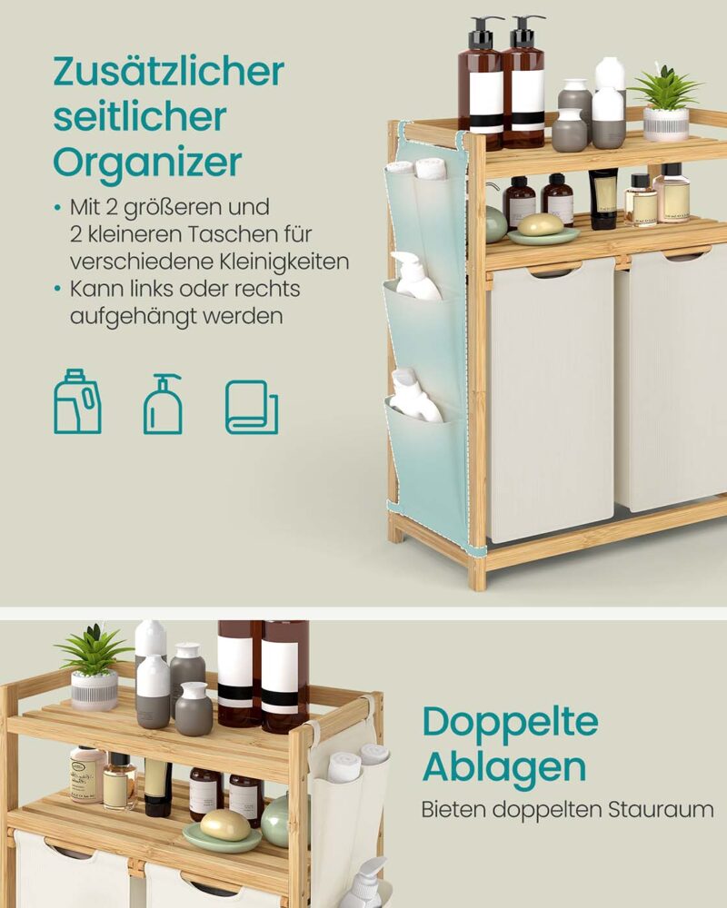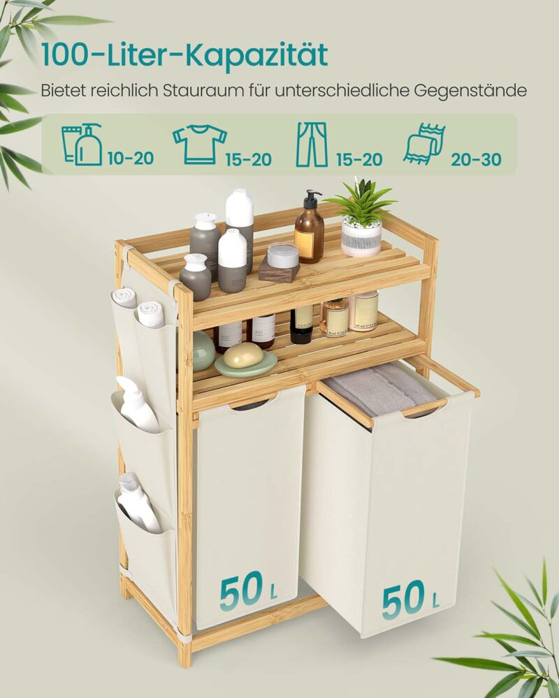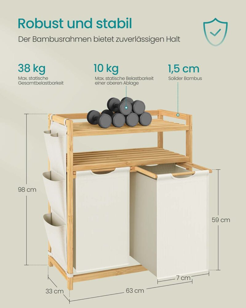 Produktdetails: Material: Bambus, Oxford-Gewebe Größe insgesamt: 63 x 33 x 98 cm (L x B x H) Größe jedes Wäschesacks: 31 x 27 x 59 cm (L x B x H) Gewicht: 6,6 kg Max. statische Belastbarkeit insgesamt: 38 kg Max. statische Belastbarkeit jedes Wäschesacks: 7 kg Max. statische Belastbarkeit einer Ablage: 10 kg
