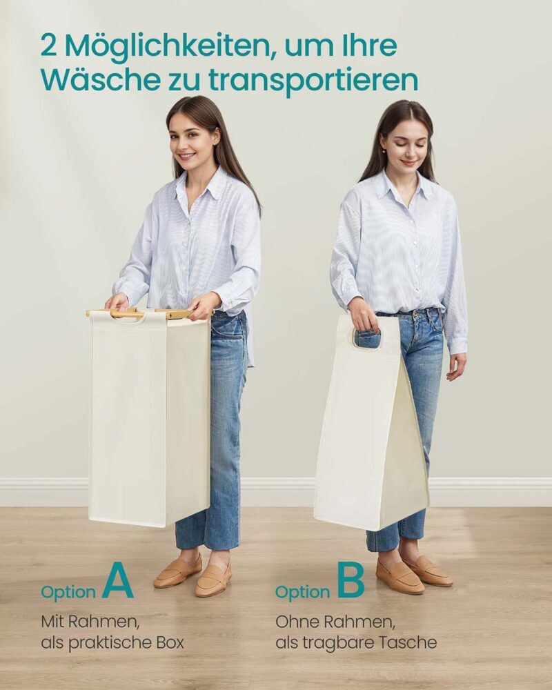 【ROBUST, STABIL UND LANGLEBIG】Aus hochwertigem Bambus gefertigt, ist der Wäschesammler solide und belastbar (Ablage bis 10 kg). Dank der Ablage mit Seitenschutz wird das Herunterfallen von Gegenständen verhindert